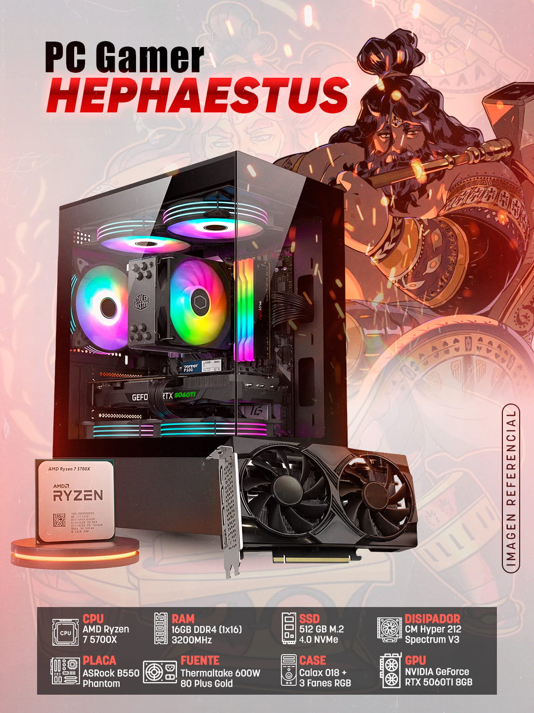 La PC Gamer Hephaestus es la obra maestra de esta línea. Impulsada por la fuerza de los 8 núcleos del procesador Ryzen 7 5700X y el poder arrollador de la NVIDIA RTX 5060 Ti, esta máquina no solo destroza cualquier título actual en Ultra, sino que es una estación de trabajo impecable. Si buscas hacer streaming fluido de alta calidad, renderizado de video pesado o diseño 3D complejo, este es tu arsenal definitivo.