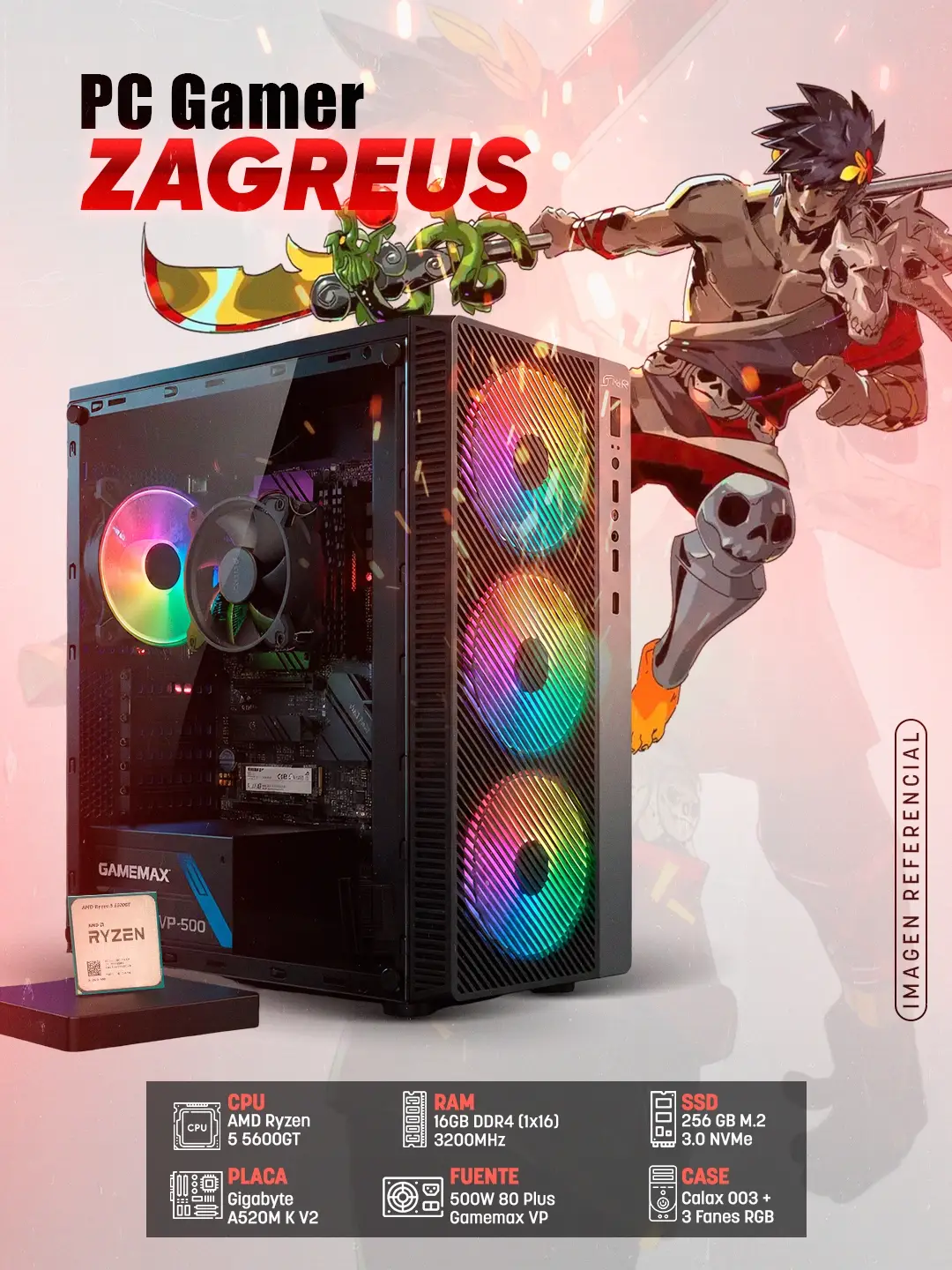 - Case: Calax 003 con panel acrílico + 3 Ventiladores RGB